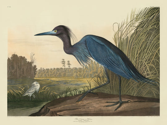 „Blauer Kranich oder Reiher, Ardea Coerulea... Blick nahe Charlestone SC“ von John James Audubon, erstmals 1827 veröffentlicht, ist ein außergewöhnliches Werk aus der berühmten Serie „Birds of America“. Diese exquisite Aquatinta im Doppel-Elefanten-Folio der Havell-Edition zeigt einen erwachsenen männlichen Blaureiher, dessen schieferblaues Gefieder elegant hervorsticht. Das Kunstwerk positioniert diesen markanten Vogel meisterhaft im Vordergrund, während ein weißer junger Reiher die grasbewachsene Feuchtlandschaft in der Nähe von Charleston, South Carolina, ziert.