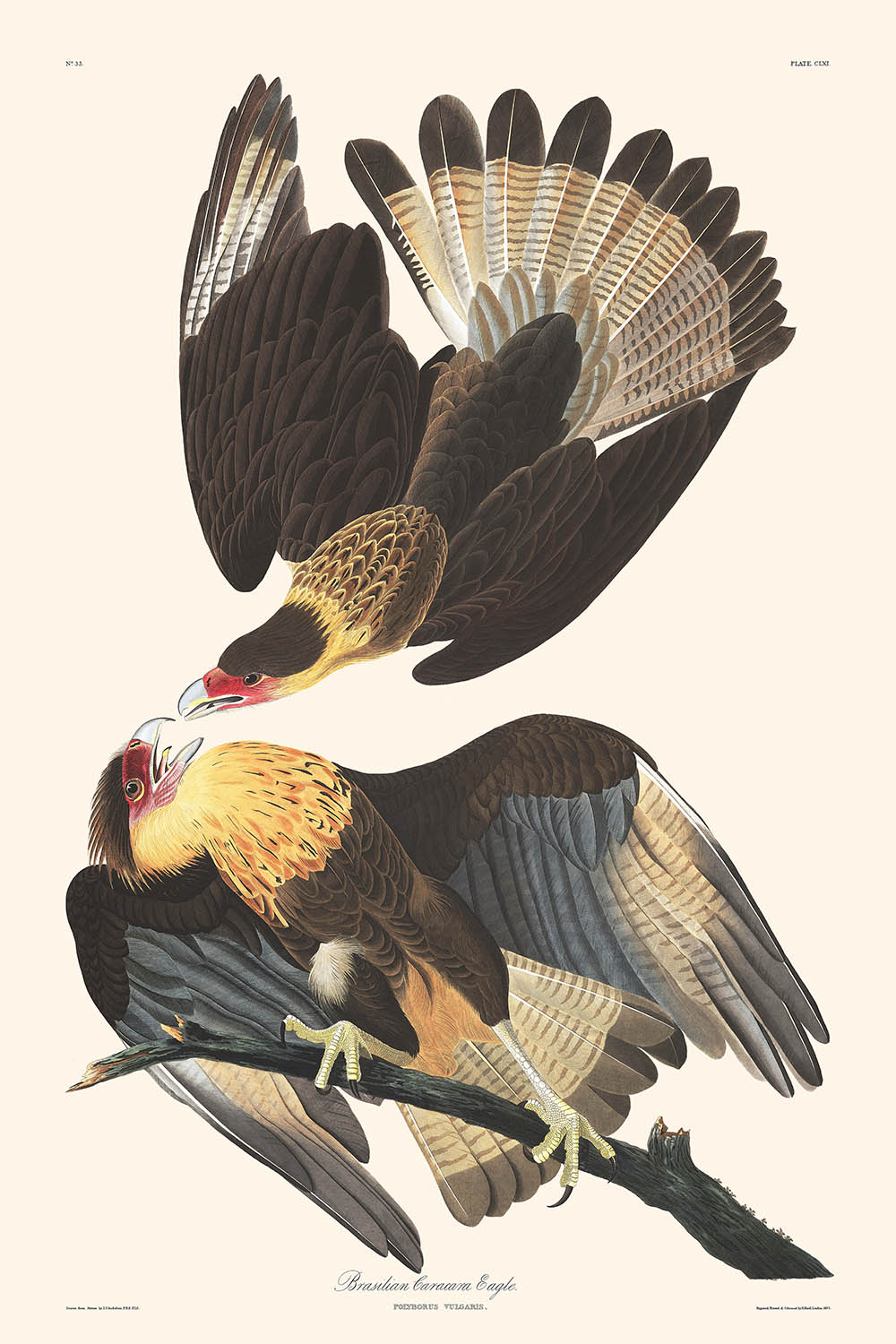 Wir präsentieren den atemberaubenden „Brasilianischen Karakara“ (Tafel 161), der vom berühmten John James Audubon geschaffen und erstmals 1827 als Teil seiner berühmten Serie „The Birds of America“ veröffentlicht wurde. Diese sorgfältige Illustration fängt den prächtigen Karakara in lebhaften Details ein und verkörpert Audubons exquisite Aufmerksamkeit für die Feinheiten der Natur.