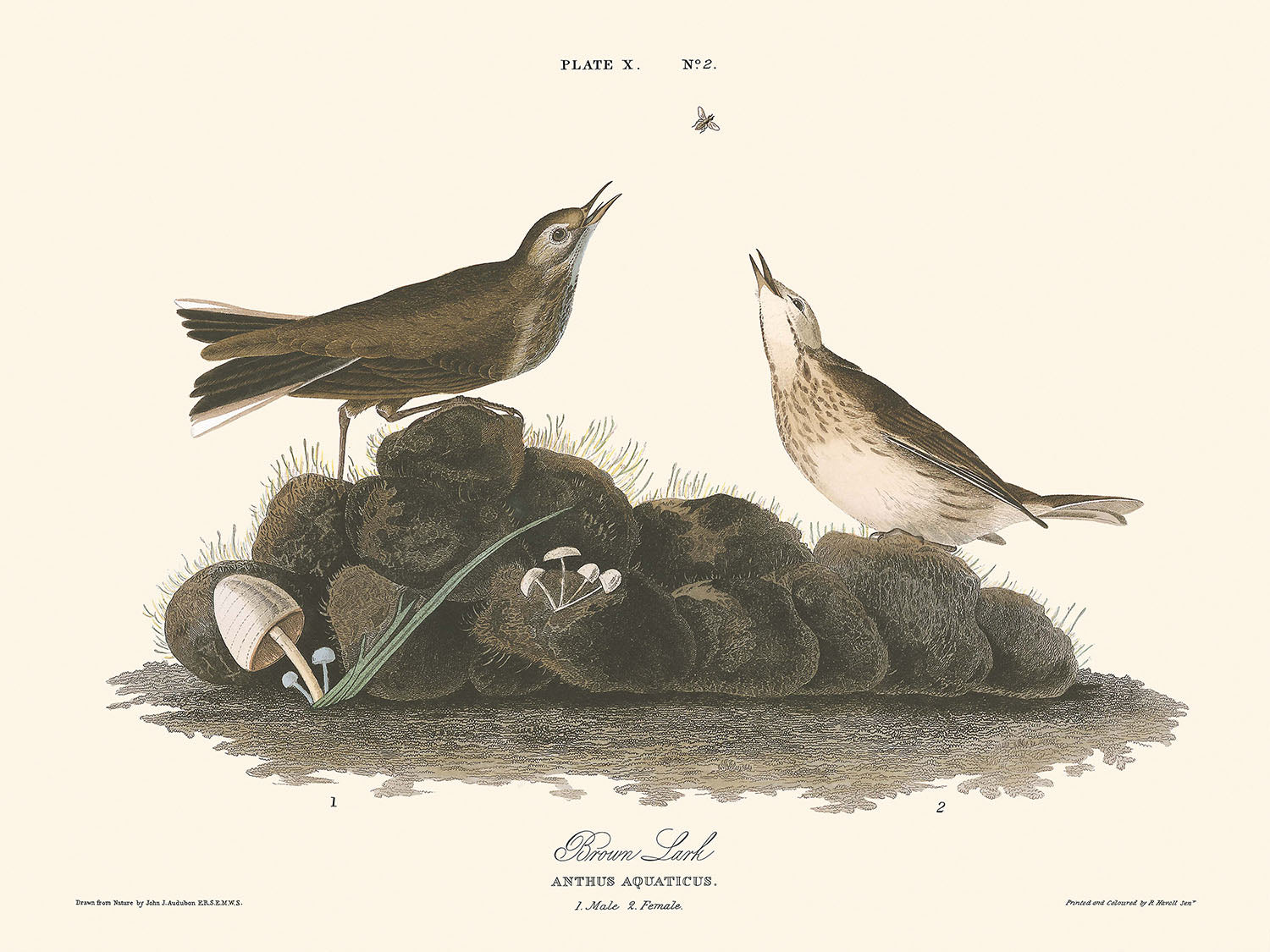 Die Seiten von Die Vögel Amerikas waren monumental – lebensgroß, um genau zu sein – was es Audubon ermöglichte, unglaublich detaillierte Illustrationen der Vögel zu erstellen, die vor kunstvoll gestalteten Landschaften gesetzt sind. Diese Illustration des Braunen Lärchens ist keine Ausnahme und zeigt feine Striche und eine auffällige Farbpalette, die dem Vogel Leben einhaucht.