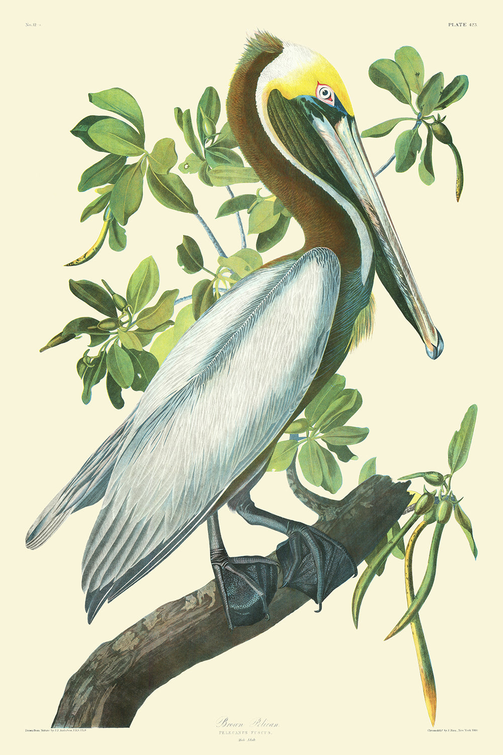 Der Braune Pelikan (Tafel 423), erstmals veröffentlicht 1827, ist eine exquisit detaillierte Illustration des renommierten Ornithologen und Malers John James Audubon. Dieses fesselnde Werk, chromolithografiert von Julius Bien im Jahr 1860, fängt lebhaft das Wesen eines brütenden erwachsenen männlichen Braunen Pelikans ein, der auf einem Ast des Roten Mangrovenbaums sitzt. Audubons akribisches Handwerk ist in dieser lebensechten Darstellung offensichtlich, die wahrscheinlich auf einer Aquarellskizze basiert, die während seiner ornithologischen Erkundungen in den Florida Keys im April oder Mai 1832 angefertigt wurde.
