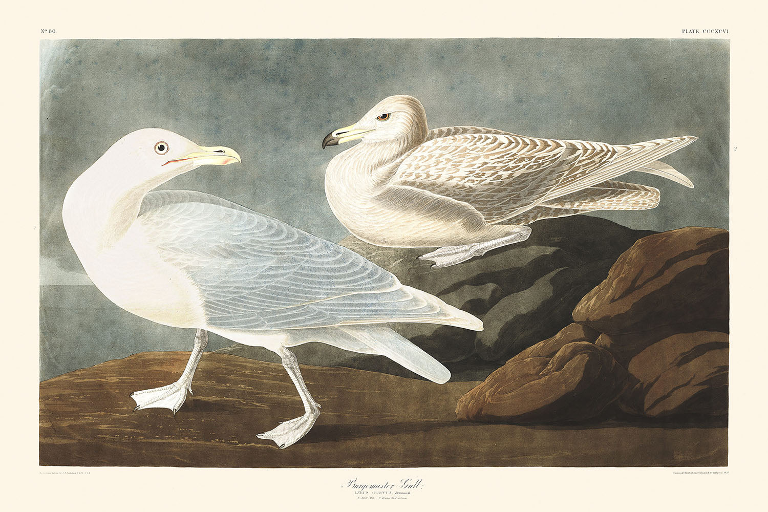Burgomaster-Möwe (Tafel 396), erstmals veröffentlicht im Jahr 1827, ist eine atemberaubende Illustration aus John James Audubons renommierter Sammlung, Die Vögel von Amerika. Diese Illustration fängt die schwer fassbare Burgomaster-Möwe in akribischen Details ein und zeigt die markanten Merkmale und die majestätische Präsenz dieser arktischen Vogelart.