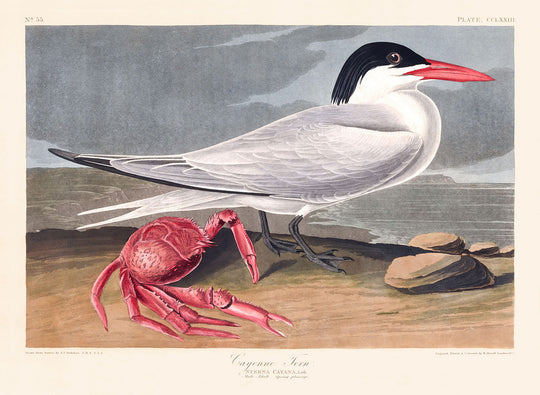 Cayenne-Tern, erstmals 1827 veröffentlicht, ist eine der attraktivsten und farbenfrohsten Illustrationen aus John James Audobons Meisterwerk, Die Vögel Amerikas.