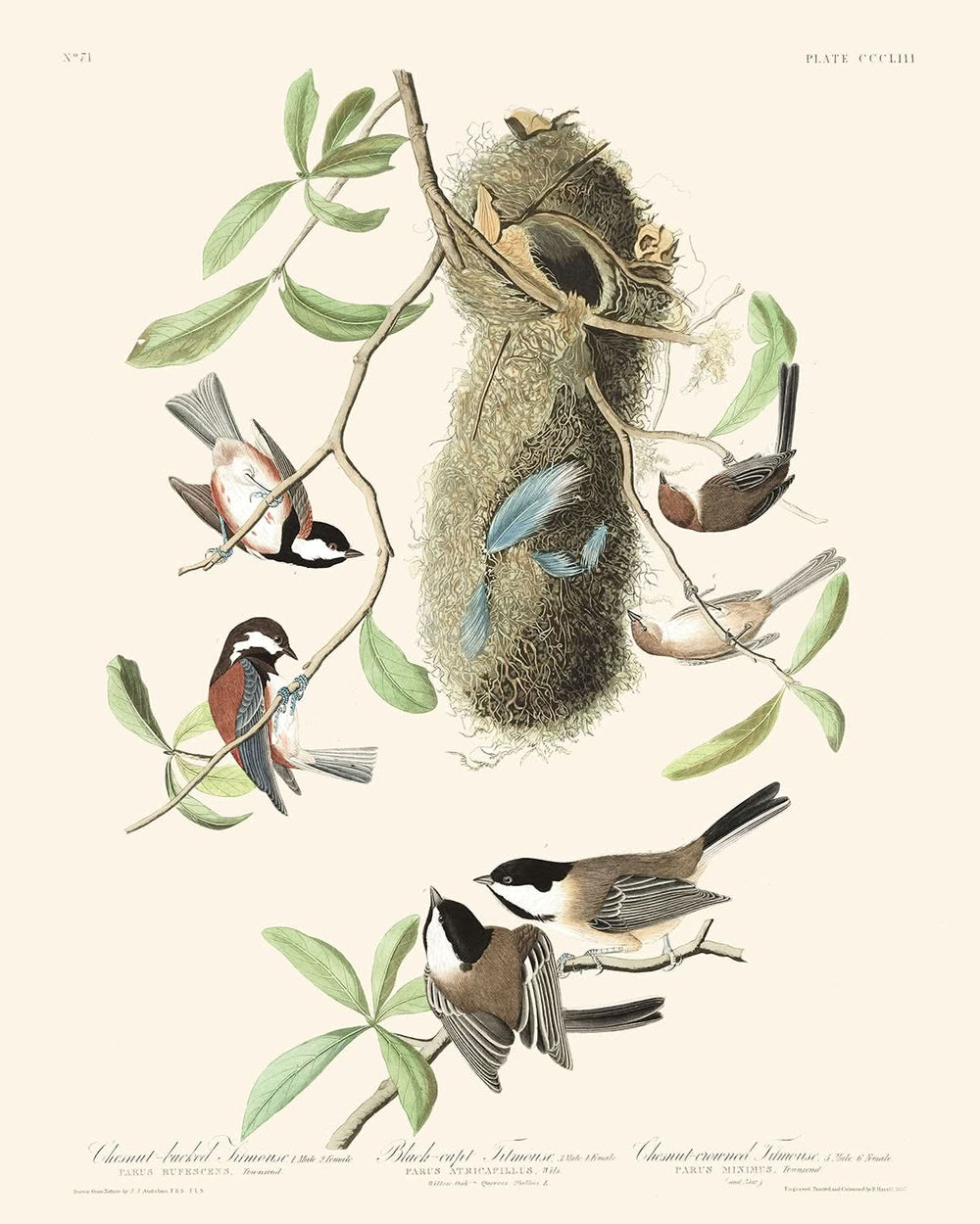 Die erstmals 1827 von John James Audubon illustrierte Kastanienrückenmeise, die Schwarzkopfmeise und die Kastanienkronenmeise ist eine fesselnde Darstellung aus seinem berühmten Werk „The Birds of America“. Dieses Kunstwerk präsentiert diese bezaubernden Vögel detailgetreu in ihrer natürlichen Eleganz und spiegelt Audubons akribische Liebe zum Detail und seine Leidenschaft für die Ornithologie wider.