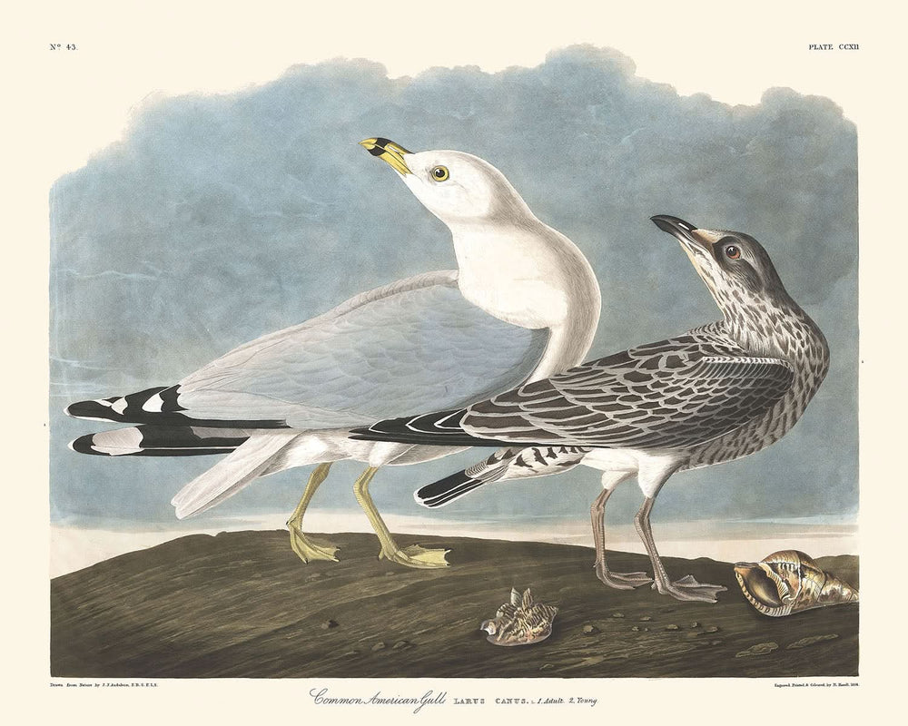 Der wissenschaftliche Name Larus zonorhynchus weist auf das umfangreiche Verbreitungsgebiet und die Anpassungsfähigkeit der Gemeinen Möwe hin. Sie ist bekannt für ihr auffälliges Aussehen und die subtilen Farbmodulationen in ihrem Gefieder – hell perlgrau im Kontrast zu einem schneeweißen Körper. Diese dynamische Farbpalette und Audubons Geschick machen dieses Kunstwerk sowohl zu einem Wunder der ornithologischen Studie als auch zu einem prächtigen Ausstellungsstück für Ihr Zuhause.