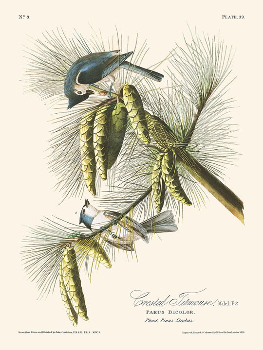 „Crested Titmouse“ (Tafel 39), erstmals 1827 veröffentlicht, ist eine der faszinierendsten Vogelzeichnungen aus John James Audubons bemerkenswerter Sammlung „The Birds of America“. Jedes Stück dieser Serie fängt die Essenz und Vitalität der Vogelwelt mit außergewöhnlicher Präzision und Kunstfertigkeit ein.
