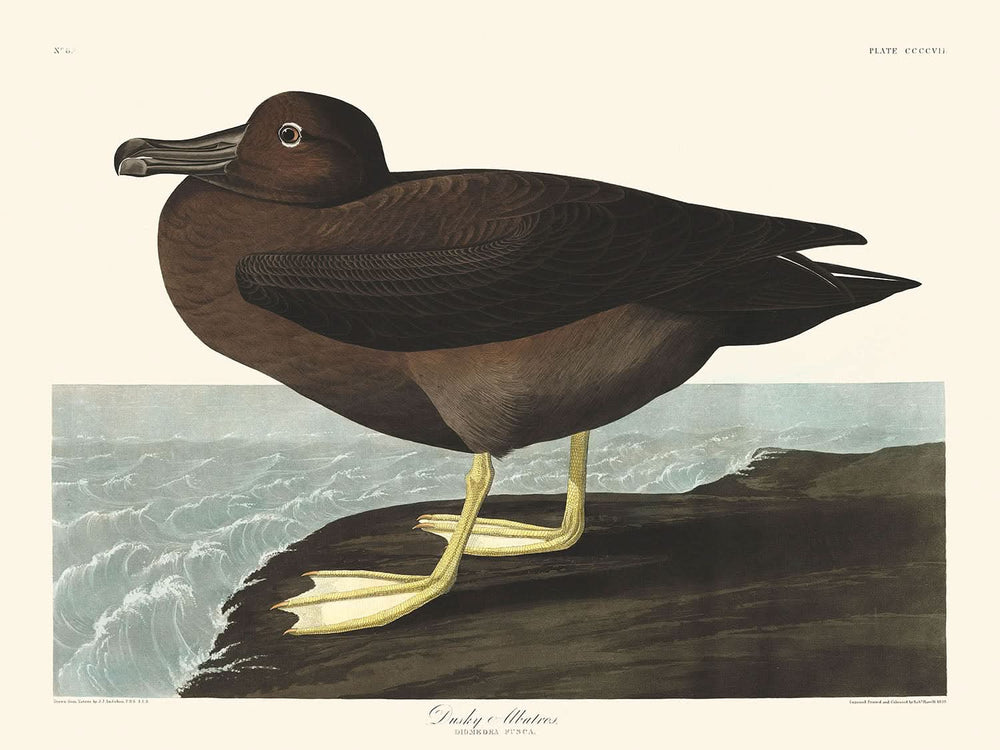 Der Dunkle Albatros ist bemerkenswert für seine komplexe Darstellung und das Geheimnis, das seine Seltenheit umgibt. Als eine Art, die Audubon zu seiner Zeit als neu betrachtete, zeigt er seine Begeisterung für die Entdeckung und Illustration des Unbekannten. Jede Feder und jedes Merkmal wird mit Präzision dargestellt, wobei die Feinheiten seines grauschwarzen Gefieders, der großen Flügelspannweite und der charakteristischen Schnabelform offenbart werden. Dieser Druck ist nicht nur ein Kunstwerk; er ist ein Eintritt in die abenteuerliche Welt der frühen amerikanischen Tierweltforschung.