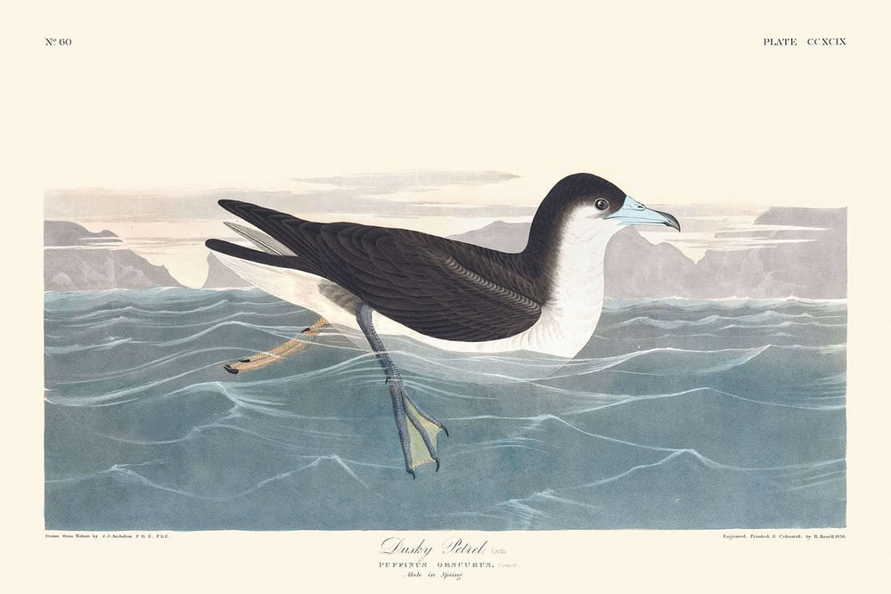 Die Illustration des Dunkelpetrels ist besonders auffällig für ihre dynamische Darstellung der Gewohnheiten dieser Vögel, während sie mühelos über das wellige Meer gleiten. Audubons Hingabe wird durch seine persönlichen Beobachtungen exemplifiziert, die treffend mit präziser Linienführung und sanften Farbtönen festgehalten wurden, sodass die Betrachter einen Einblick in die natürliche Welt erhalten, wie Audubon sie selbst erlebt hat.