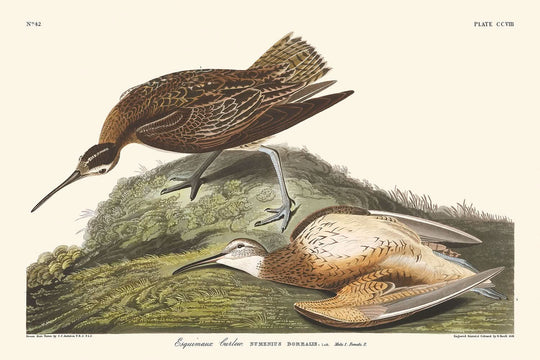 Esquimaux Curlew von John James Audubon, erstmals 1827 veröffentlicht, gehört zu den bemerkenswerten Vogelillustrationen aus Audubons außergewöhnlicher Sammlung „The Birds of America“. Dieses fesselnde Werk fängt die zarte Eleganz und den schnellen Flug des Esquimaux Curlew ein, eines Vogels, dessen Wandermuster und Gewohnheiten ebenso faszinierend sind wie die Illustration selbst.