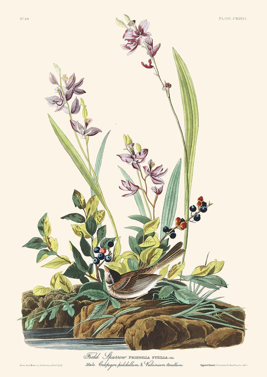 Die Darstellung des Feldsperlings besticht besonders durch ihre anmutigen Details, die die feinen Merkmale des Vogels und die Feinheiten seines Lebensraums einfangen. Audubons Darstellung lädt den Betrachter in eine heitere Welt ein, in der das raschelnde Gras diesen winzigen Geschöpfen Schutz und Nahrung bietet.