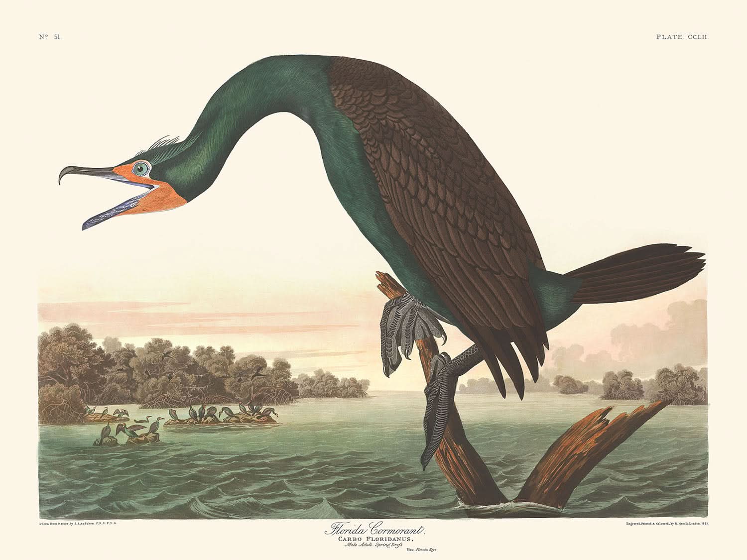 Der Florida-Kormoran ist besonders bemerkenswert für seine auffällige Präsenz und einzigartigen Verhaltensweisen, wie von Audubon beschrieben. Er bevorzugt innere Wasserwege und nistet in Bäumen, im Gegensatz zu seinen Verwandten, die Felsen oder Klippen bevorzugen. Indem er ihre gemeinschaftliche Natur und Fortpflanzungsgewohnheiten beobachtete, erfasste Audubon das Wesen der Art und betonte ihre gesellige, aber selektiv einsame Fortpflanzungswahl. Dieser feine Druck bietet den Betrachtern mehr als nur eine Darstellung; er bietet Einblicke in die Naturgeschichte dieser Vögel zur Zeit der frühen amerikanischen Erkundung.