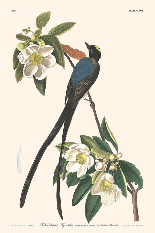 Der Gabelschwanz-Fliegenschnäpper (Tafel 168), illustriert vom renommierten Naturforscher und Künstler John James Audubon, ist eine faszinierende Vogelillustration aus seiner berühmten Serie „Birds of America“. Audubons 1827 zusammengestellte Werke sind bekannt für ihre detailreichen und naturgetreuen Darstellungen von Vogelarten, die die lebendige Individualität jedes Vogels in seinem natürlichen Lebensraum einfangen.