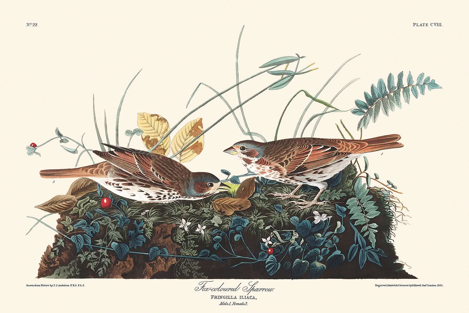 Erstmals 1827 veröffentlicht, ist der "Fuchsfarbene Spatz" des renommierten John James Audubon eine exquisite Vogelillustration aus seinem gefeierten Werk, Die Vögel Amerikas. Audubon war ein bahnbrechender Naturforscher, dessen akribische Darstellungen amerikanischer Vögel seit fast zwei Jahrhunderten das Publikum fesseln. Seine detaillierte und lebensechte Darstellung des Fuchsfarbenen Spatzen - eines Vogels, der für sein melodisches Lied und sein lebhaftes Gefieder bekannt ist - ist ein Beweis für sein unvergleichliches Können und seine Hingabe, die Schönheit der Natur festzuhalten.