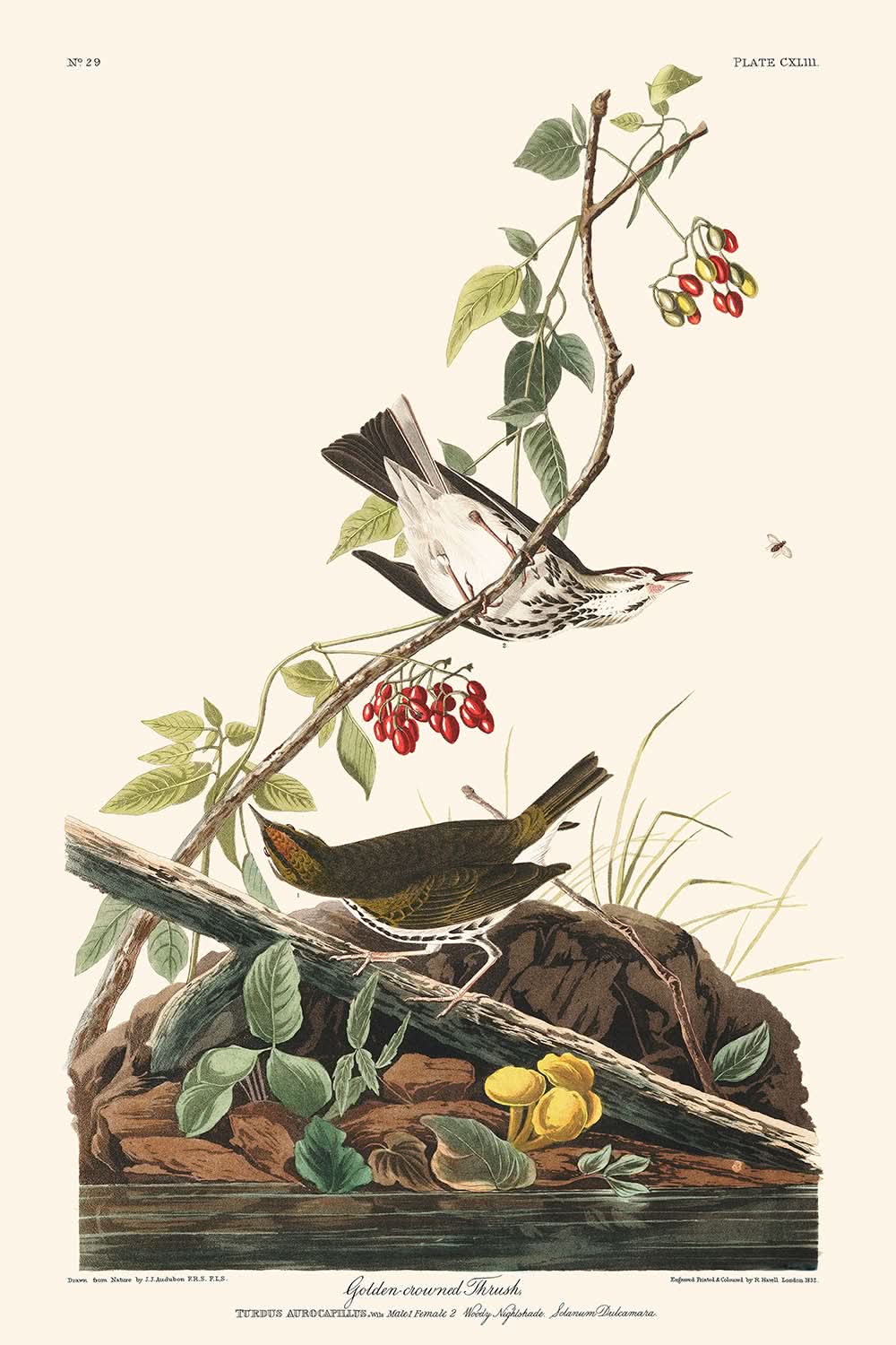 Die Goldkronendrossel (Tafel 143), erstmals 1827 von John James Audubon veröffentlicht, ist eine exquisite Darstellung aus seinem berühmten Werk The Birds of America. Diese fesselnde Illustration fängt die Eleganz und den natürlichen Lebensraum der Goldkronendrossel ein, die aufgrund ihrer einzigartigen Nistweise auch als Ofenvogel bekannt ist.