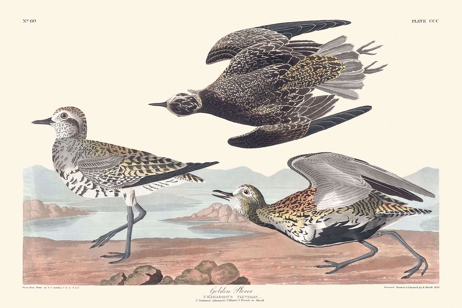 „Golden Plover“, erstmals veröffentlicht im Jahr 1827, fängt als Teil von John James Audubons berühmtem Kompendium „The Birds of America“ die anmutige Eleganz dieses Zugvogels in exquisiten Details ein.