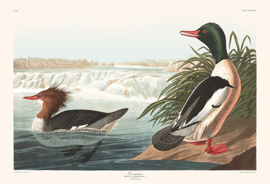 Der Gänsesäger (eine Art von Meeresente), erstmals veröffentlicht 1827, ist eine der farbenfrohesten und interessantesten Illustrationen aus John James Audobons Meisterwerk, Die Vögel Amerikas.