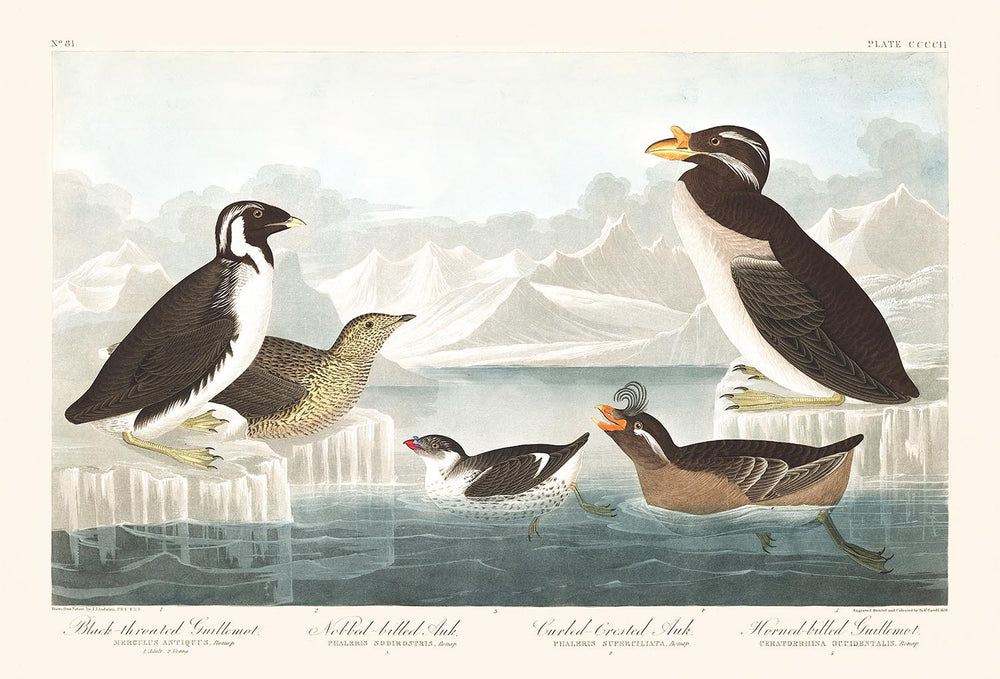 Aufmerksame Naturforscher werden bemerken, dass all diese Vögel von Audobon falsch klassifiziert wurden. Es wäre schwierig, irgendeine Erwähnung eines hornraben-Guillemots in moderner Literatur zu finden. Heutzutage bezeichnen wir die beiden Guillemots in dieser Illustration als Murres oder Gemeine Murre, ein Mitglied der Familie der Alken. (Und tatsächlich sind die beiden kleineren Vögel im Wasser ebenfalls Alken). Alle diese Vögel sind hervorragend im Wasser und können nach Fischen tauchen, sind aber etwas unbeholfen an Land.