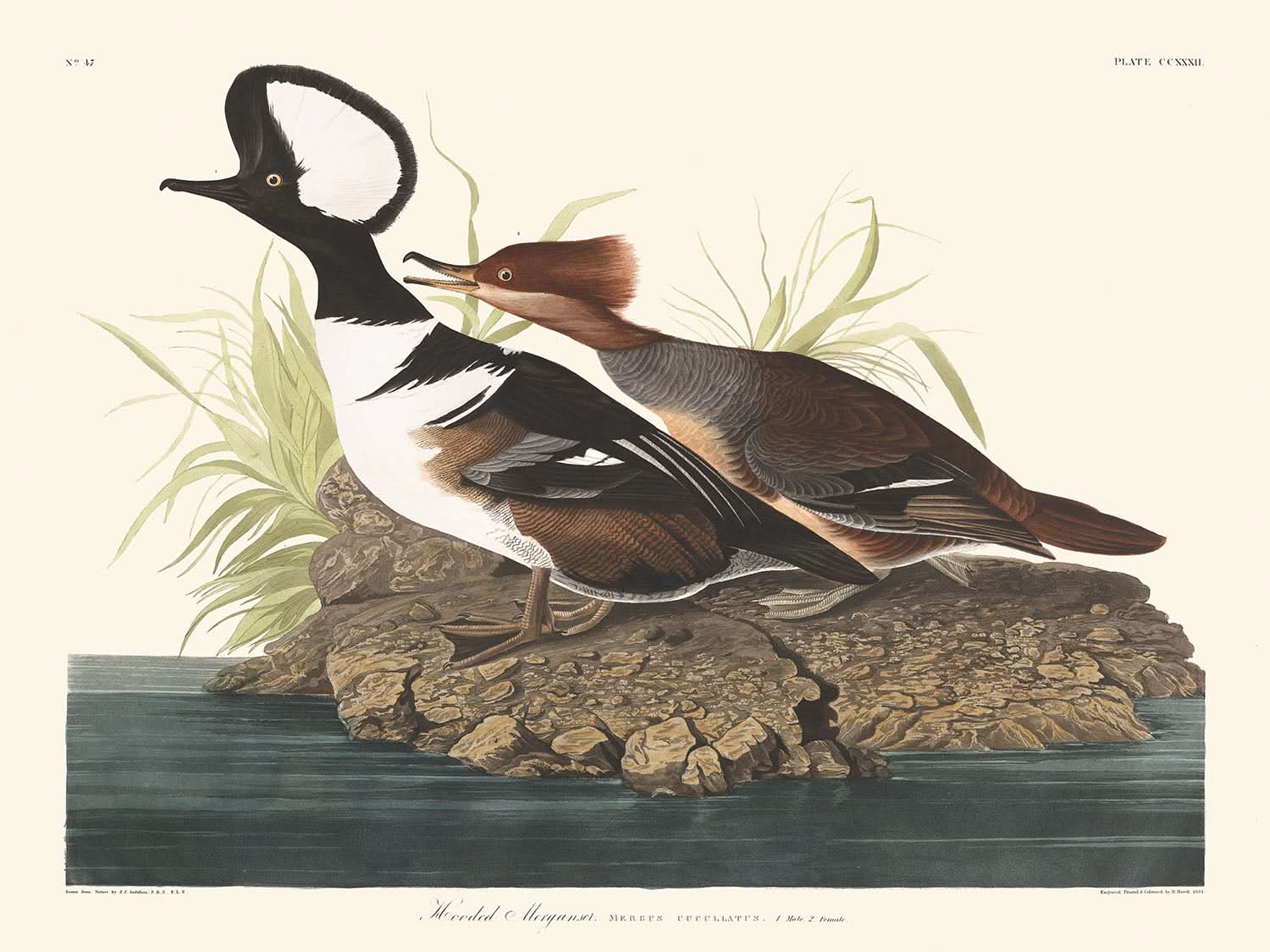 Der erstmals 1827 veröffentlichte Hooded Merganser ist einer der bemerkenswertesten und sorgfältigsten illustrierten Vögel aus John James Audubons herausragendem Werk The Birds of America. Dieses Kunstwerk zeigt die majestätische Präsenz des Hooded Merganser, der für sein markantes Aussehen und sein faszinierendes natürliches Verhalten bekannt ist.