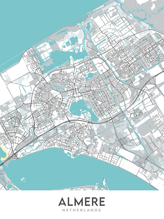 Diese Karte von Almere, Niederlande, ist ein modernes und detailliertes kartografisches Kunstwerk, das eine stilvolle Ergänzung zu Ihrer Inneneinrichtung sein wird. Die Karte konzentriert sich auf die Stadt Almere und die größere Region der Niederlande und ist als schönes und informatives Kunstwerk konzipiert. Die Karte deckt eine Vielzahl von Stadtteilen ab, darunter Almere Stad, Almere Buiten, Almere Haven, Almere Poort, Almere Hout, Almere Pampus, Almere Overgooi, Almere Seepark, Almere Muziekwijk, Almere Filmwijk, Almere Sportwijk, Almere Nobelwijk, Almere Waterwijk und Almere Danswijk, Almere Literatuurwijk, Almere Kunstwijk, Almere Architectenwijk, Almere Stedenwijk, Almere Regenboogwijk und Almere Duin.