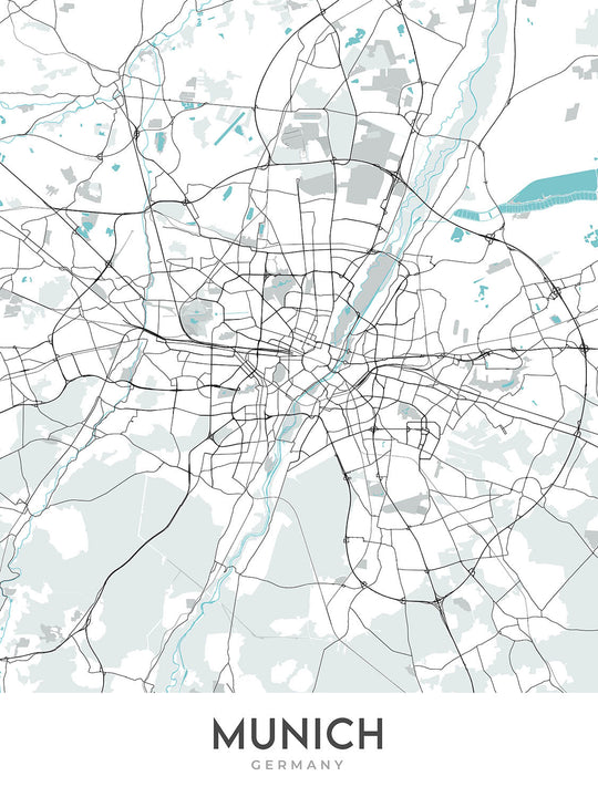 Moderne Stadtkarte von München, Deutschland: Altstadt, Marienplatz, Englischer Garten, Allianz Arena, Isarfluss