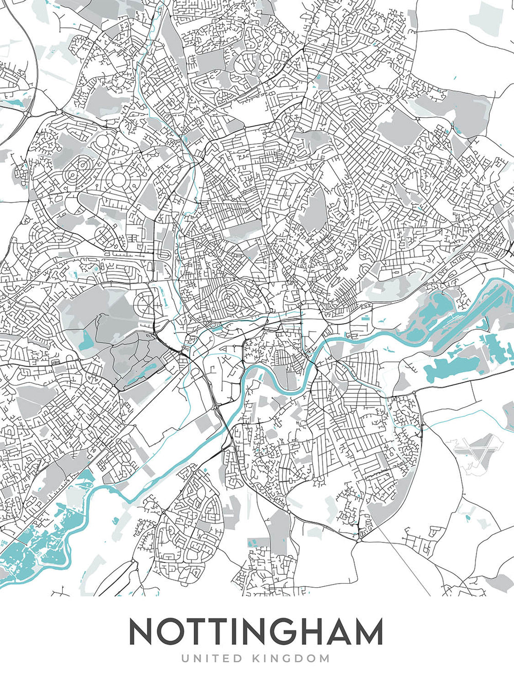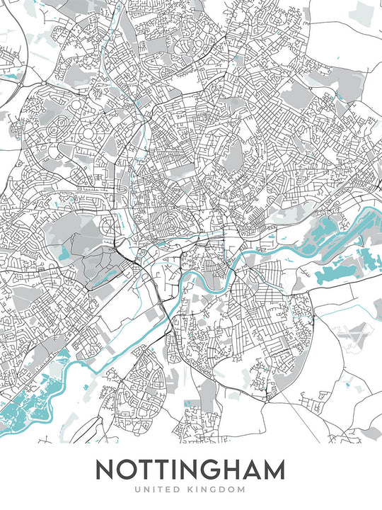 Diese Karte von Nottingham ist eine moderne, detaillierte Straßenkarte ohne Etiketten, perfekt, um jedem Zuhause oder Büro einen Hauch von zeitgenössischem Stil zu verleihen. Die Karte deckt einen weiten Bereich der Stadt ab, darunter das Stadtzentrum, The Park, Lenton, Beeston, Wollaton, West Bridgford, Carlton, Arnold, Mapperley und Sherwood.