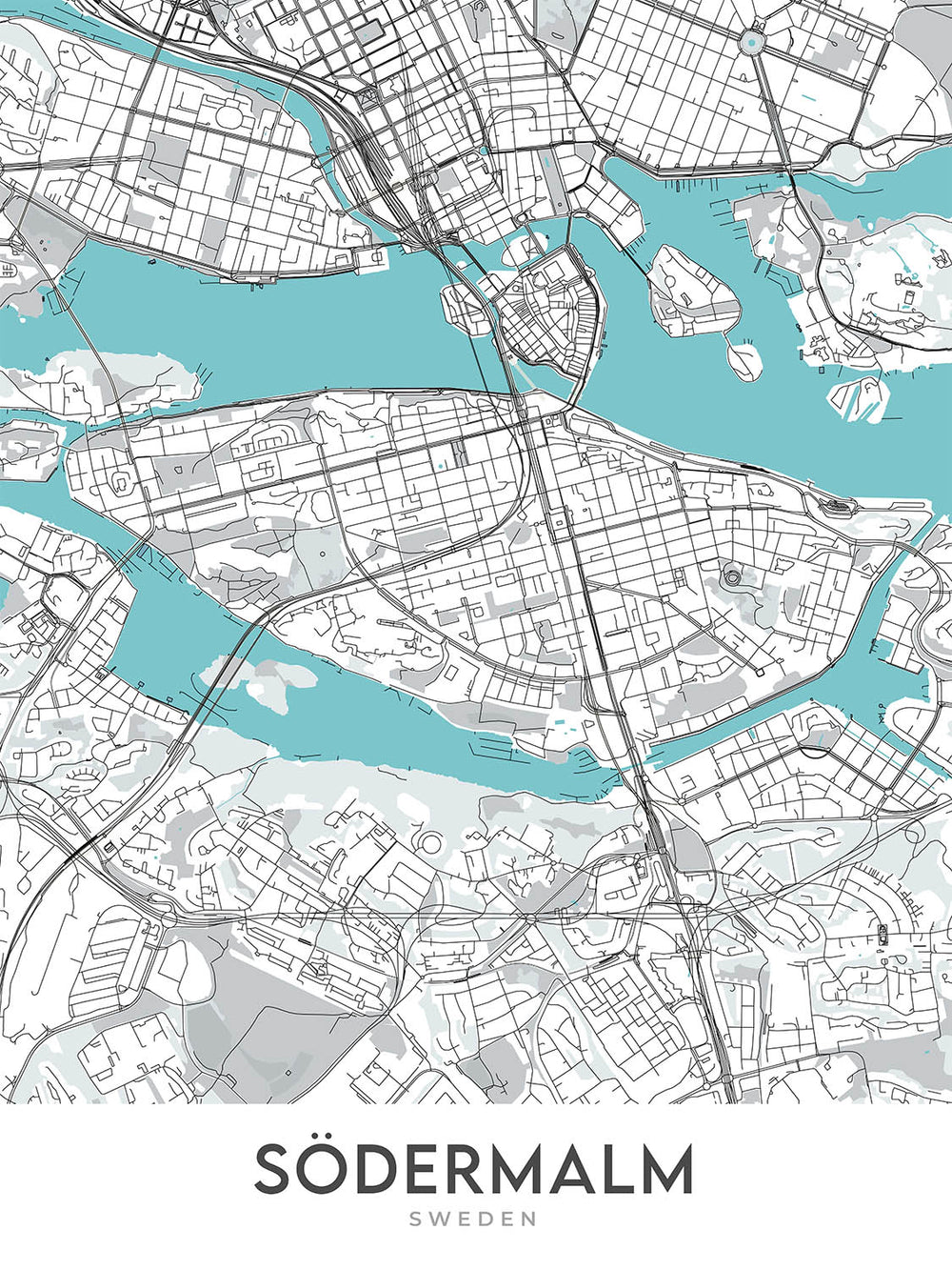 Mit dieser Karte von Södermalm können Sie dieses faszinierende Viertel perfekt erkunden. Es ist ein schönes und informatives Kunstwerk, das jedem Zuhause oder Büro einen Hauch von Stil verleiht.