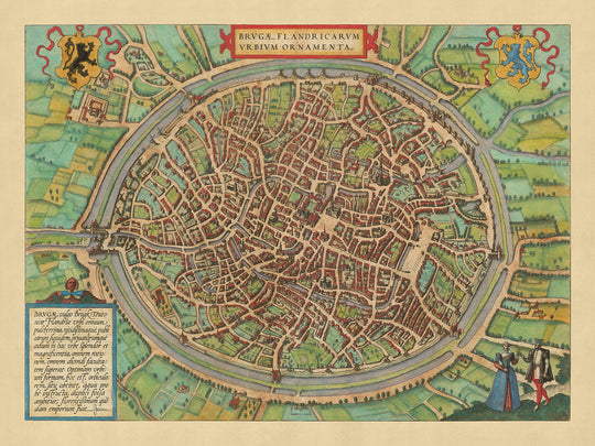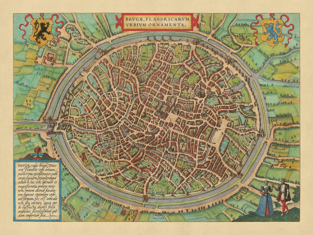 Zur charmanten Ausstrahlung der Karte tragen die durchdachten Illustrationen bei, die sie begleiten, darunter ein Paar, das in der unteren rechten Ecke steht und vielleicht das Leben und den Geist der Stadtbewohner symbolisiert. Der dekorative Kartusche in der oberen linken Ecke verstärkt die ästhetische Anziehungskraft der Karte und macht sie nicht nur zu einem historischen Dokument, sondern auch zu einem Kunstwerk. Diese künstlerischen Elemente, zusammen mit der detaillierten Darstellung von Brügge, machen sie zu einem faszinierenden Stück für Sammler, Historiker und Kunstliebhaber.