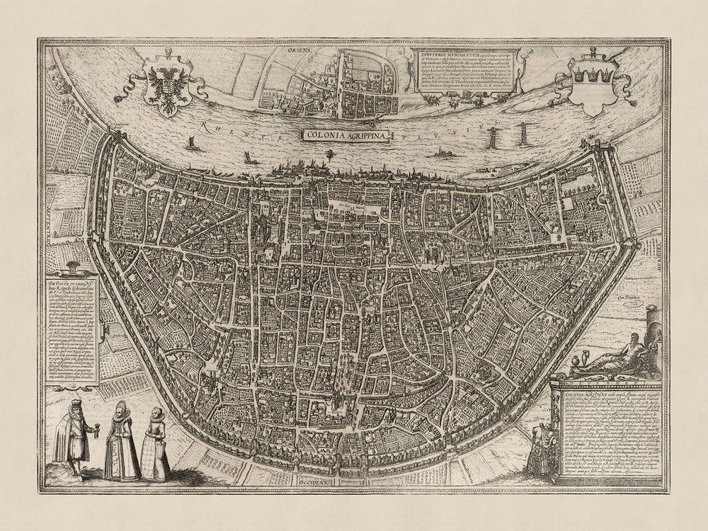Im Wesentlichen ist "Colonia Agrippina" von Georg Braun mehr als nur eine Karte; es ist ein Luxusartefakt, das den Geist Kölns im 16. Jahrhundert einfängt. Ihre detaillierte Stadtlandschaft, reichen historischen Erzählungen und künstlerischen Flair machen sie zu einem geschätzten Besitz für jeden Sammler oder Enthusiasten der Geschichte und Kartografie. Diese Karte lädt die Betrachter ein, die Kopfsteinpflasterstraßen Kölns zu durchqueren, ihre Stadtteile, Wahrzeichen und den fließenden Rhein zu erkunden, alles bequem von zu Hause aus. Ein wahres Meisterwerk der Spätrenaissance, steht sie als Zeugnis für die Verschmelzung von künstlerischer Pracht und empirischer Beobachtung und verewigt das architektonische, politische und spirituelle Gefüge Kölns während einer bedeutenden Epoche seiner Geschichte.