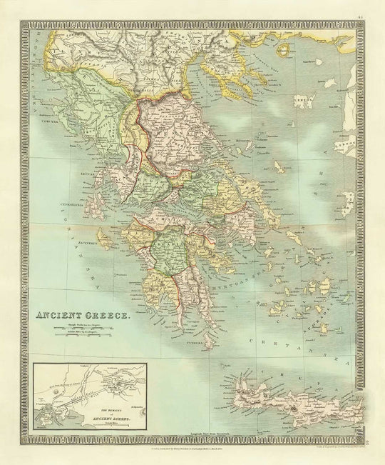 Die Karte zeigt das antike Griechenland, einschließlich Mazedonien in den Norden, wie es in etwa dem 12. bis 9. Jahrhundert v. Chr. Eine schöne Inset-Karte in der unteren linken Ecke zeigt eine Nahaufnahme des modernen Tages Reste von alten Athen.