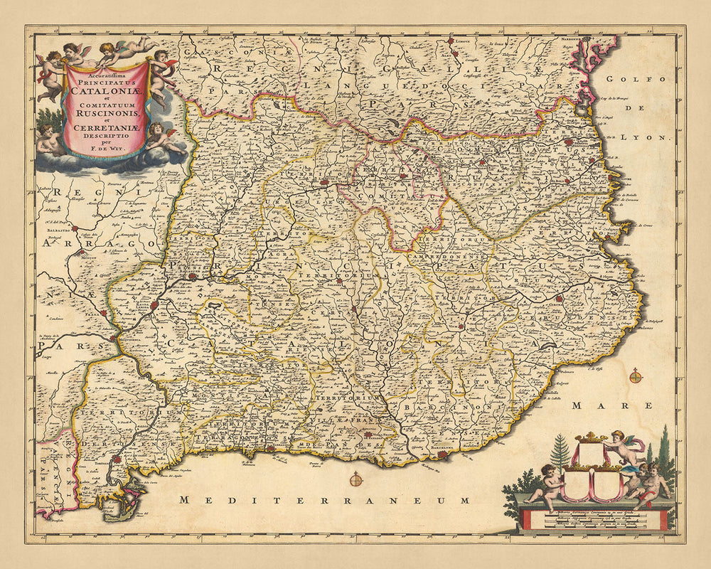 Tauchen Sie ein in die reiche Geschichte und die komplizierte Geographie der „Accuratissima principatus Cataloniae et comitatuum Ruscinonis, et Cerretaniae descriptio“, einer faszinierenden Karte, die 1690 von Nicolaes Visscher II. angefertigt wurde. Der ins Englische übersetzte Titel der Karte lautet „Die genaueste Beschreibung von“. das Fürstentum Katalonien und die Grafschaften Roussillon und Cerdanya. Wenn Sie diese akribisch detaillierte Karte erkunden, werden Sie in das späte 17. Jahrhundert zurückversetzt, als Katalonien ein blühendes Fürstentum innerhalb des größeren Gebiets war, das heute als Spanien bekannt ist.