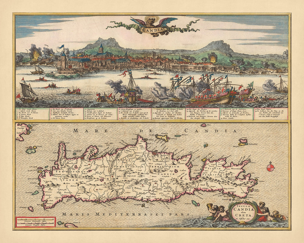 Das Besondere an dieser Karte ist die Detailansicht unten, die die türkische Belagerung von Candia veranschaulicht. Ein sorgfältig unten platzierter Schlüssel hilft beim Auffinden von 33 Sehenswürdigkeiten und ermöglicht es dem Betrachter, tiefer in den historischen Kontext der Region einzutauchen. Von Städten und Gemeinden bis hin zu Wasserstraßen und Kanälen ist jeder Aspekt der Landschaft vertreten und bietet einen umfassenden Überblick über Kreta in dieser Zeit.