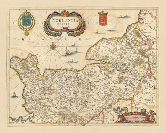 Diese exquisite Karte bietet nicht nur eine geografische Perspektive, sondern auch einen einzigartigen historischen Einblick in das Herzogtum Normandie. Es ist ein unverzichtbares Stück für jeden Geschichtsinteressierten oder Kartografieliebhaber. Entdecken Sie die Feinheiten dieser Karte und begeben Sie sich auf eine Zeitreise in das Herzogtum Normandie im Jahr 1690.