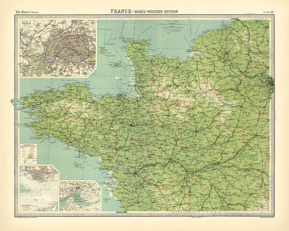 Bartholomews Kunstfertigkeit ist sofort im Design der Karte erkennbar, das akribisch politische Grenzen mit einer eindrucksvollen Darstellung der physischen Geographie der Region in Einklang bringt. Durch die Verwendung von hypsometrischen Farbtönen erweckt die Karte die sanften Hügel und Flusstäler der Normandie und der Bretagne zum Leben, während bathymetrische Schattierungen die Tiefen des Ärmelkanals und der Atlantikansätze offenbaren. Die Klarheit und Präzision, für die Bartholomew bekannt war, sind in vollem Umfang zu sehen, was diese Karte sowohl zu einem praktischen Nachschlagewerk als auch zu einem visuellen Genuss für Kenner der historischen Kartografie macht.
