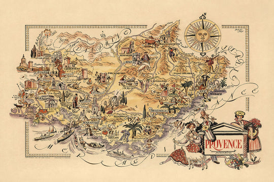 Die bildlichen Elemente der Karte sind besonders bemerkenswert. Die dekorative Kompassrose, ein Grundelement traditioneller Kartografie, verleiht der Karte einen Hauch von alter Welt. Das Relief wird bildlich dargestellt und bietet eine dreidimensionale Perspektive, die die Karte zum Leben erweckt. Die anderen Themen der Karte - Monaco, Nizza, Cannes, Avignon und Marseille - sind alle mit ihren einzigartigen Wahrzeichen und Merkmalen vertreten und bieten einen Einblick in ihre charakteristischen Identitäten innerhalb der größeren Provence-Region.