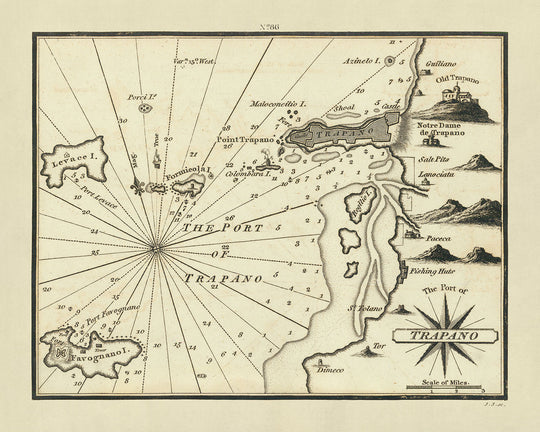 Heathers Karte ist weit mehr als ein einfacher Führer; sie ist ein reiches Gewebe aus lokaler Geografie und menschlicher Aktivität. Sie markiert akribisch die Salinen und Fischerhütten, die für die lokale Wirtschaft von Trapani von wesentlicher Bedeutung waren, neben den monumentalen Merkmalen wie dem Torre di Ligny und dem Lazzaretto di Trapani. Jedes dieser Merkmale ist nicht nur ein Punkt auf einer Karte, sondern eine Tür zu den täglichen Leben derjenigen, die zu Beginn des 19. Jahrhunderts in Trapani lebten und arbeiteten. Die Aufnahme solcher Details bietet einen lebendigen Einblick in die sozioökonomischen Bedingungen der Zeit und macht diese Karte zu einer wertvollen Ressource sowohl für Navigatoren als auch für Historiker.