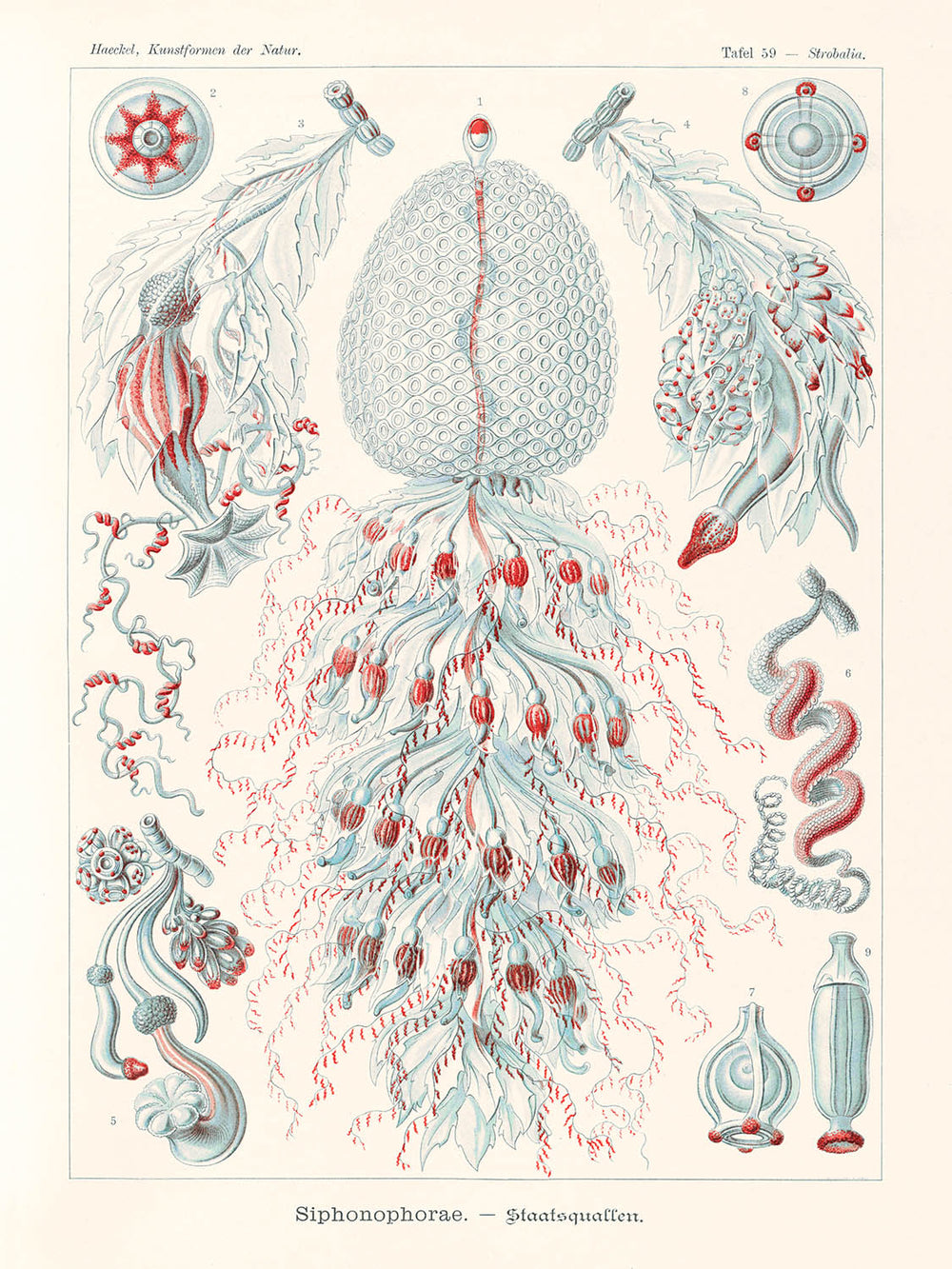 "Siphonophorae Staatsquallen (Tafel 59)" von Ernst Haeckel, veröffentlicht im Jahr 1904, ist eine faszinierende medusoid polyp Zooid-Illustration aus Haeckels einflussreichem Werk "Kunstformen der Natur." Dieses Kunstwerk zeigt eine exquisite Anordnung verschiedener Zooidarten, die detailliert und mit meisterhaftem Einsatz von Farbe und Form gestaltet sind, was Haeckels Hingabe an die natürliche Welt verdeutlicht.