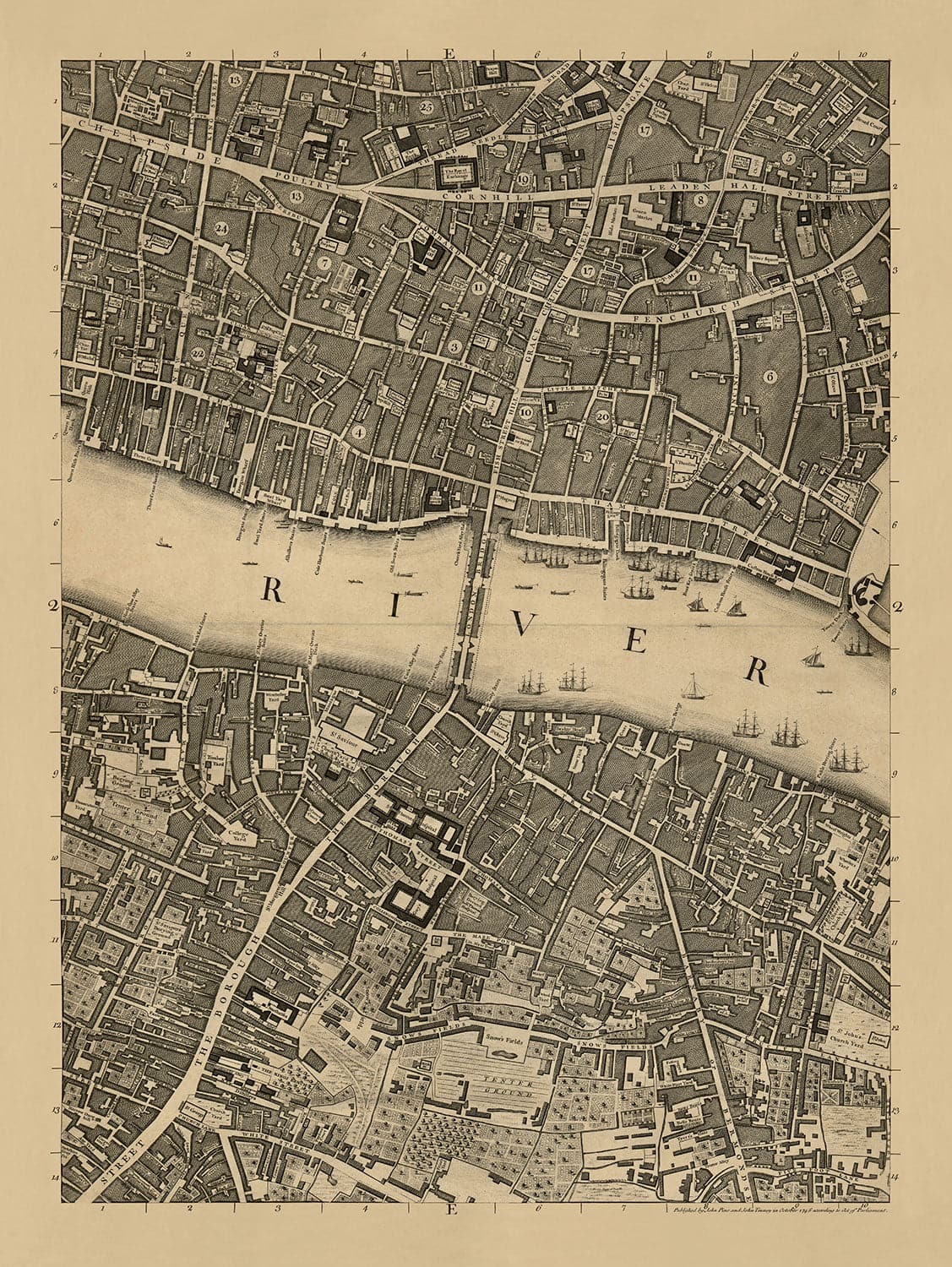 Diese Karte wurde ursprünglich in 24 Blatt veröffentlicht. Die hier angezeigte Karte ist Blatt E2, der sich auf den von der London Bridge gespannten Themse mit Bezirk auf der Südseite und der Stadt London auf der Nordseite konzentriert.