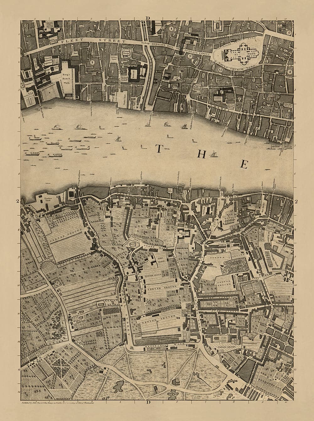 Diese Karte wurde ursprünglich in 24 Blatt veröffentlicht. Die hier angezeigte Karte ist Blatt 12, der sich auf den Dicht der Themse zwischen Blackfriars und Tempel auf der Nordseite (Stadt London) und Southbank und Bankside auf der Südseite (Lambeth und Southwark) konzentriert. Schnell vorwärts 250 Jahre und Sie sehen das Tate Modern und Royal Festival Saal auf der Südseite des Flusses. Die Nordseite des Flusses wird von der Kathedrale von St. Pauls dominiert, aber Sie können auch Fleet Street und Ludgate Hill sehen. "BlackFriars-Treppen" und "Tempel-Treppen" zeigen Ihnen, wo die modernen U-Bahnstationen gebaut werden würden.
