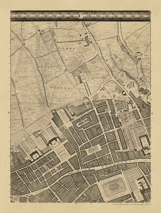 Diese Karte wurde ursprünglich in 24 Blättern veröffentlicht. Die hier gezeigte Karte ist das Blatt C1, das sich auf die Gebiete nördlich und südlich von High Holborn und die zentralsten Teile des Stadtteils Camden konzentriert. Einige der wichtigsten Orte, die auf dieser Karte dargestellt sind, umfassen Lincoln's Inn Fields, Bloomsbury Square, das Gebiet, das Russell Square werden würde, Great Ormond Street (aber das Krankenhaus ist noch nicht ganz dort), Red Lyon Square, der Raum, der das British Museum werden würde (es sind hier nur Felder und Gärten), Gray's Inn Road und Platz und viele mehr.
