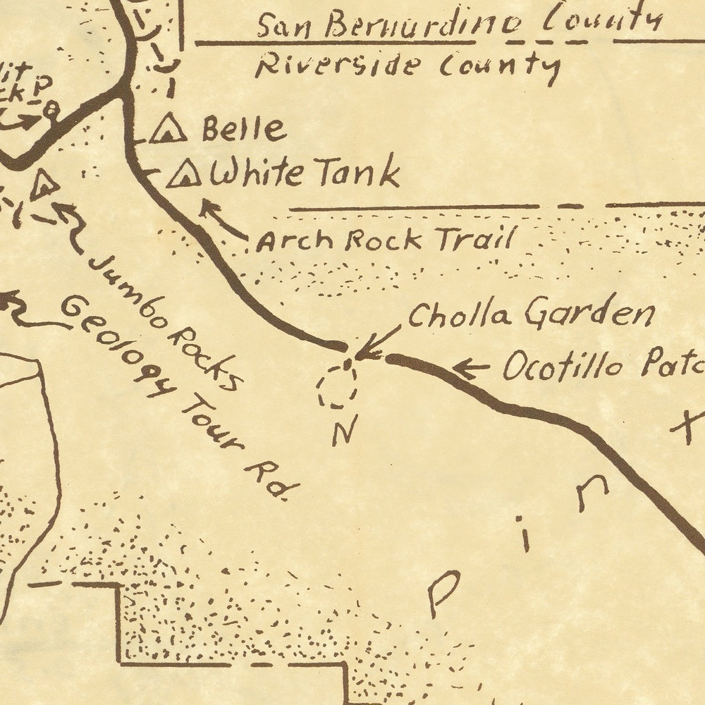 The terrain itself is rendered with tactile intimacy. Sculptural rock gardens at White Tank and the arching sweep of Arch Rock Trail are depicted with a climber’s appreciation for form and a naturalist’s eye for sequence. Hidden Valley and Indian Cove emerge as storybook enclaves of stone and shade, while the Cholla Garden bristles on the page with the same improbable exuberance it summons at dawn. From Key’s View (Salton View), the map gestures toward distant horizons and the shimmer of the Salton Basin, even as Piñon Canyon and Cottonwood anchor the southern reaches. Trails braid these spaces together—hiking paths and horseback routes, and the long spine of the California Riding-Hiking Trail—inviting exploration paced to the desert’s rhythm.