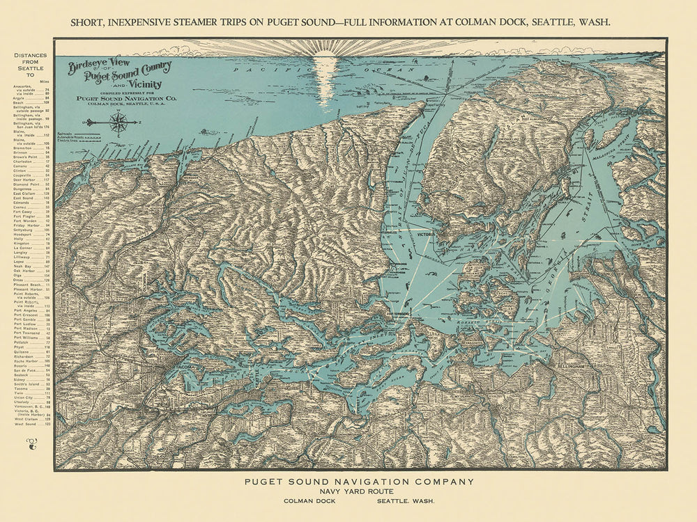 Betreten Sie die lebendige maritime Welt des pazifischen Nordwestens mit der „Vogelperspektive auf das Puget Sound Land und Umgebung“, einem eindrucksvollen kartografischen Meisterwerk aus dem Jahr 1927, das von der Puget Sound Navigation Company in Auftrag gegeben wurde. Diese fesselnde Karte, die zur Blütezeit der Dampfschifffahrt in der Region entstanden ist, lädt die Betrachter ein, eine Landschaft zu erkunden, die durch ihre komplizierten Wasserwege, majestätischen Berge und üppigen Inseln geprägt ist. Der ursprüngliche Titel selbst deutet auf die panoramatische Ambition der Karte hin, die eine umfassende Perspektive bietet, die das Puget Sound, die Olympic Peninsula, die San Juan Islands, Vancouver Island und die umliegende Region umfasst – ein Gebiet, in dem Natur und Navigation auf spektakuläre Weise miteinander verwoben sind.