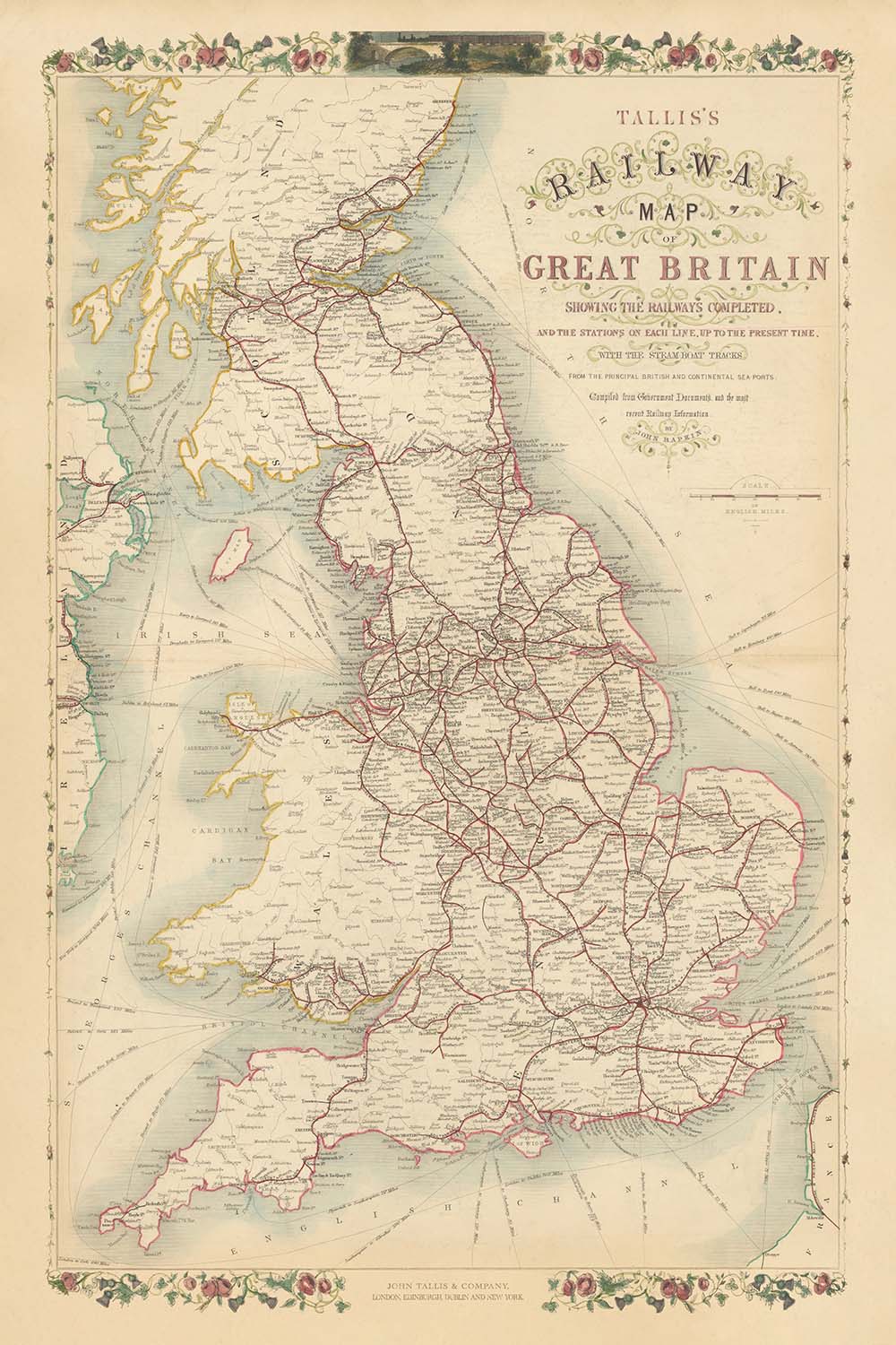 Alte Eisenbahnkarten von Großbritannien von Tallis, 1850: London, Liverpool, Manchester, Dampfschifffahrtsrouten, verzierte Ränder