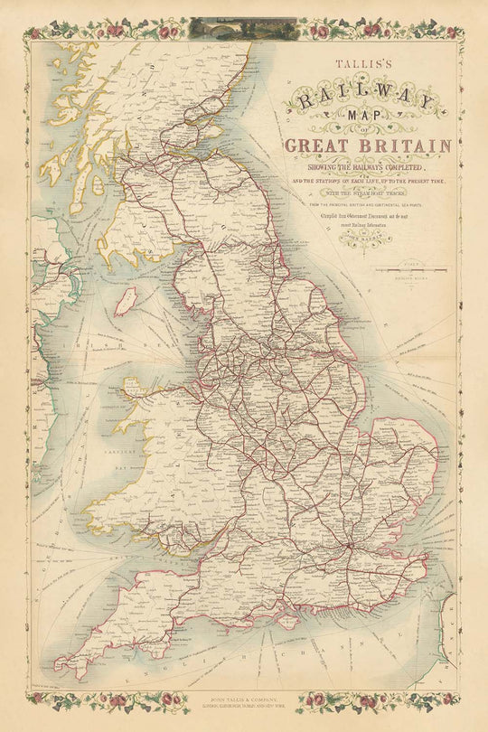 John Tallis, bekannt für seine eleganten und dekorativen kartografischen Werke, verlieh dieser Karte ein Gefühl von Größe und Klarheit. In Zusammenarbeit mit John Rapkin, dessen akribisches Gravieren die Details zum Leben erweckte, stellte Tallis sicher, dass jede Linie und Station nicht nur genau – mühsam aus Regierungsdokumenten und den neuesten Eisenbahninformationen zusammengestellt – sondern auch visuell fesselnd war. Der kunstvolle Rahmen der Karte ist wunderschön.