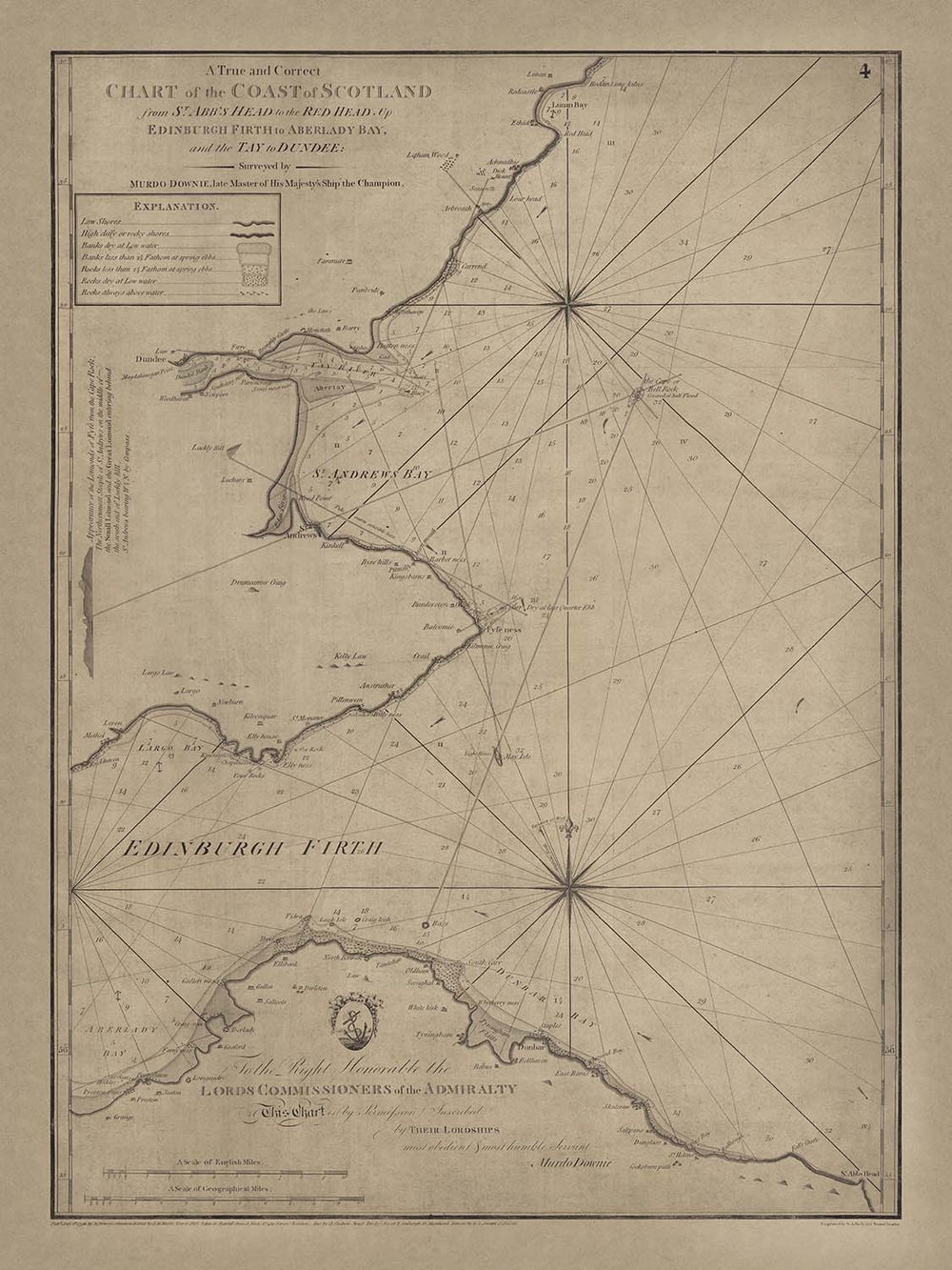 Die Karte ist reich an Navigationsdaten, einschließlich Wassertiefen, die sorgfältig in Faden gemessen wurden, um eine sichere Passage für Schiffe, die diese Gewässer befahren, zu gewährleisten. Kompassrosen und strahlende Kurslinien sind deutlich dargestellt und leiten die Seefahrer durch die Komplexität des Edinburgh Firth, der St Andrew's Bay und anderer Küstengebiete. Die Einbeziehung dieser Elemente spiegelt die Präzision und Praktikabilität von Downies kartografischer Arbeit wider, die von den Lords Commissioners of the Admiralty in Auftrag gegeben wurde, um maritime Unternehmungen zu unterstützen.