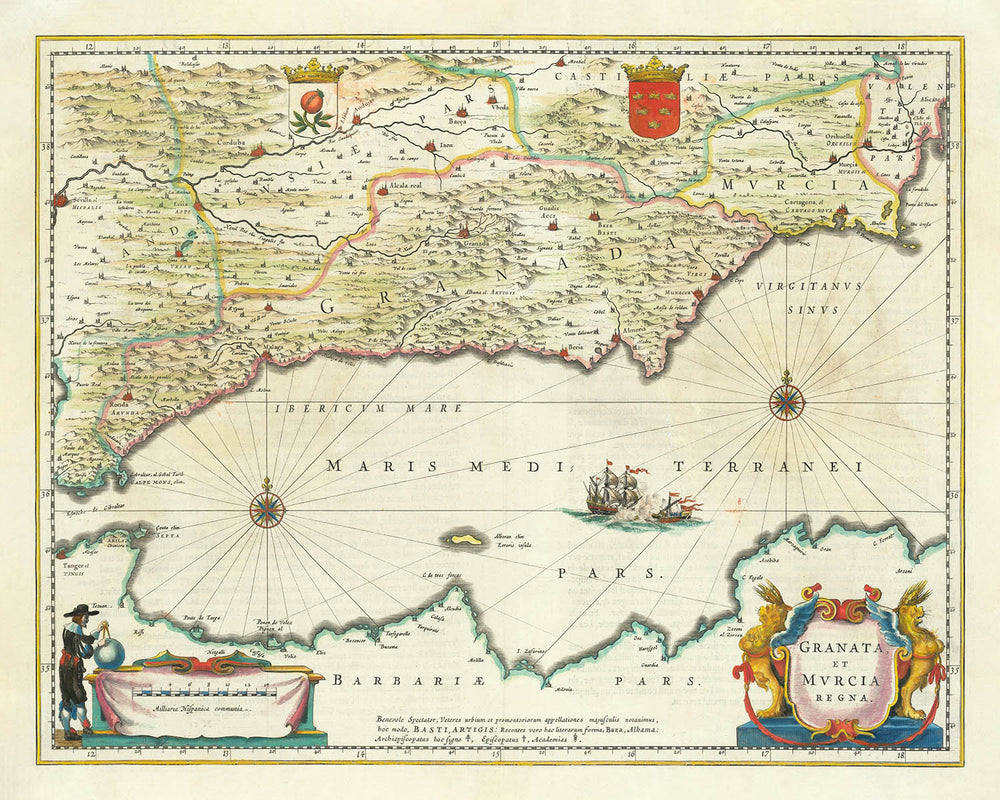 Die auf der Karte dargestellten Städte und Dörfer, wie Granada, Malaga, Cordoba und Murcia, sind reich an Geschichte und kulturellem Erbe. Granada, das Herz der Nasriden-Dynastie und Heimat der ikonischen Alhambra, wird prominent dargestellt, ebenso wie Cordoba, ein Zentrum für Lernen und Kultur während des islamischen Goldenen Zeitalters. Die Karte umfasst auch kleinere Städte wie Alcalá la Real, die eine strategische Rolle in der Reconquista spielte. Jede Siedlung ist sorgfältig beschriftet und bietet einen Einblick in die urbane Landschaft Spaniens im 17. Jahrhundert.