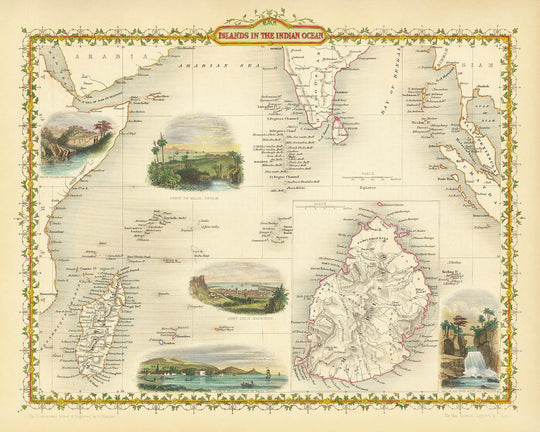 Das Design der Karte ist ein Zeugnis für Tallis' einzigartigen kartografischen Stil. Eingekapselt in einen kunstvollen dekorativen Rahmen, ist die Karte mit exquisit detaillierten Vignetten geschmückt, die die Region zum Leben erwecken. Diese Illustrationen, wie der geschäftige Hafen von Port Louis in Mauritius und die malerische Küste von Point De Gall in Ceylon, bieten einen seltenen Einblick in die Landschaften und das tägliche Leben des mittleren 19. Jahrhunderts. Die farbenfrohe Darstellung und die sorgfältige Beschriftung von Städten, Flüssen und Küstenmerkmalen bieten sowohl visuelle Freude als auch historische Einsicht.