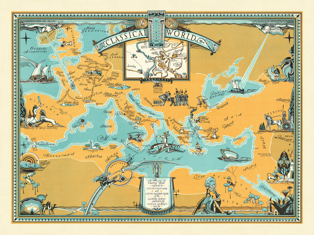 Betreten Sie die fesselnde Welt der Antike mit "Die Klassische Welt", einer bemerkenswerten Karte, die 1930 von William L. Longyear erstellt wurde. Dieses exquisite Stück, veröffentlicht von Silver Burdett & Company, dient als Tor zur Pracht des Römischen Reiches, das sich rund um das Mittelmeer erstreckt. Entworfen für Bildungszwecke, schmückte es Latein-Lehrbücher der Climax-Serie und bot den Schülern eine visuelle Reise durch die Zeit. Die lateinischen Ortsnamen der Karte wecken die wissenschaftlichen Bestrebungen der damaligen Zeit, während die Art Deco-Verzierungen Leben in die Krieger, Wagenlenker und mythologischen Figuren einhauchen, die ihre Oberfläche zieren.