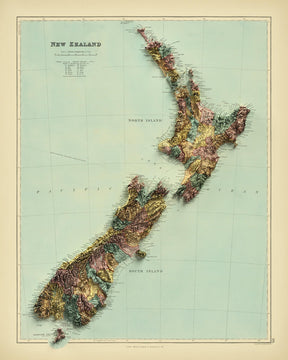 Die Karte zeigt Neuseelands Nord- und Südinsel und hebt die natürliche Schönheit und geografischen Merkmale hervor, die das Land definieren. Die Südalpen erstrecken sich majestätisch über die Südinsel, während der umgebende Pazifische Ozean und die Tasmansee die Küstenlinie des Landes einrahmen. Diese Karte dient nicht nur als geografischer Leitfaden, sondern auch als historischer Schnappschuss der Landschaft Neuseelands im späten 19. Jahrhundert.