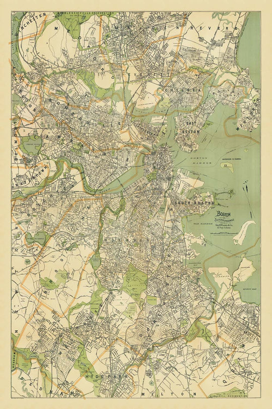Zu den faszinierendsten Merkmalen der Karte gehören die Darstellungen von Bostons gefeierten Parks und öffentlichen Räumen. Der Boston Common und der Public Garden, im Zentrum der Stadt gelegen, sind deutlich markiert, ebenso wie die grünen Flächen des Franklin Parks und des Arnold Arboretums im Süden. Die Back Bay Fens und der Jamaica Pond bieten weitere Beweise für das Engagement der Stadt für grüne Flächen und spiegeln den Einfluss von Frederick Law Olmsteds Parksystem Emerald Necklace wider. Diese Wahrzeichen, zusammen mit den mäandrierenden Flüssen Charles und Mystic und dem ikonischen Hafen von Boston, bieten einen üppigen Kontrapunkt zum dichten urbanen Gewebe der Stadt und unterstreichen die Bedeutung der Natur in Bostons bürgerlicher Identität.