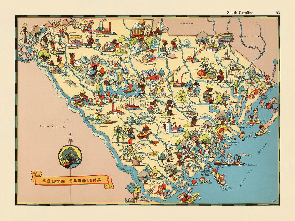 Das Design dieser Karte ist nichts weniger als bezaubernd. Jeder Landkreis ist klar abgegrenzt, mit Grenzen und Namen sorgfältig beschriftet, während die üppigen Landschaften des Staates durch Illustrationen von Kiefernwäldern, sanften Feldern und der funkelnden Atlantikküste zum Leben erweckt werden. Das Fehlen moderner Autobahnen und Infrastruktur wird mehr als ausgeglichen durch den Reichtum an bildlichen Details – landwirtschaftliche Szenen, Vieh und lokale Industrien erscheinen alle und bieten einen Einblick in das ländliche und industrielle Erbe South Carolinas. Der Atlantische Ozean bildet eine elegante östliche Grenze, gesprenkelt mit Booten und Strandszenen, die auf die maritimen Traditionen des Staates hinweisen.