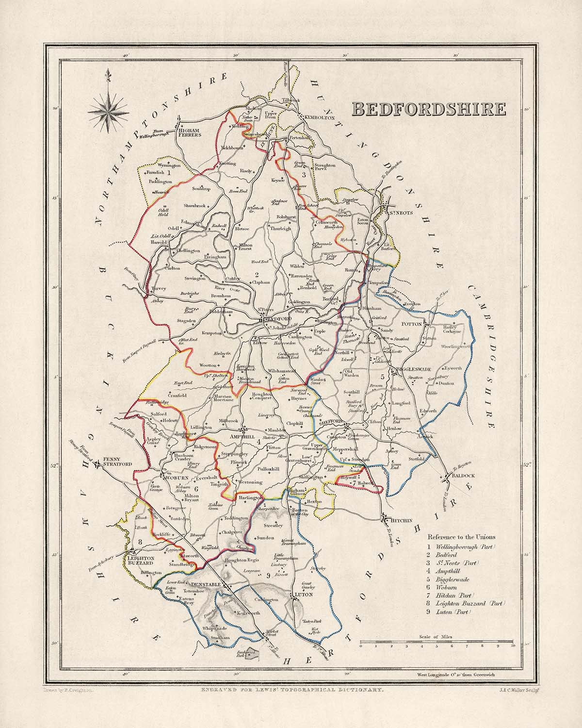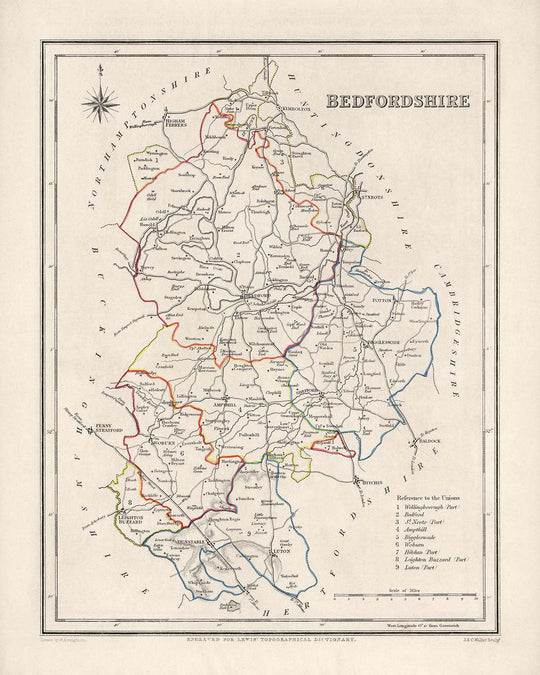 Die alte Karte von Bedfordshire von Samuel Lewis aus dem Jahr 1844 ist ein fesselndes und historisch bedeutsames Stück, das einen Einblick in die Vergangenheit bietet. Diese sorgfältig gestaltete Karte zeigt die Grafschaft Bedfordshire in England in einer Zeit großer Veränderungen und Entwicklungen. Es bietet eine einzigartige Gelegenheit, die reiche Geschichte der Region sowie die Entwicklung ihrer Städte zu erkunden.